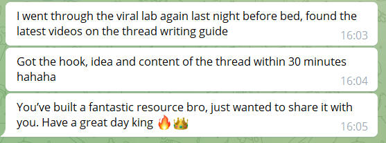 "There comes a time when you don't know what to write. The database in the Viral Inspiration Lab is an ultimate solver. I just open it and start reading through tweets or threads. It takes me a minute or two to get an idea for my next tweet. It just pops up in my head, really. And it's a good one, because it's inspired by good ones. Magic."