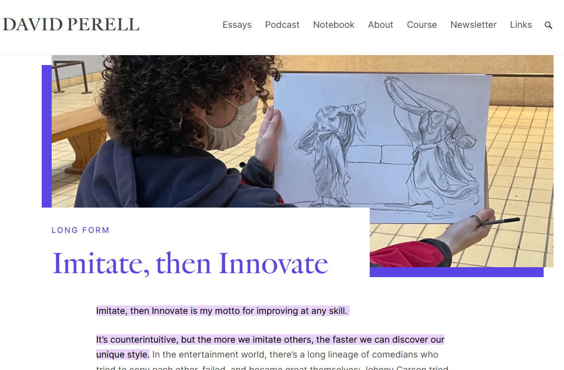 I stumbled across the 'social media' solution 3 years ago, when I found David Perell.I was struggling to grow my account.I was posting every day but getting nowhere.And I hated how much time I spent on platforms.I felt distracted and frustrated.Perrell's advice to get good at writing?'Imitate then innovate'.He explains that you shouldn't try to reinvent the wheel.It's much faster to model what works.