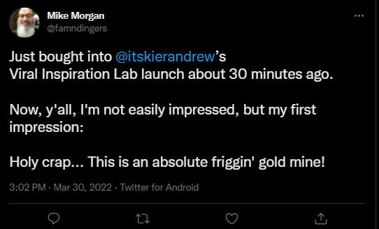 "The bottleneck for me is always ideation. Viral Inspiration lab has cut my writing time in half. This is a must buy if you're trying to write better."