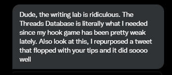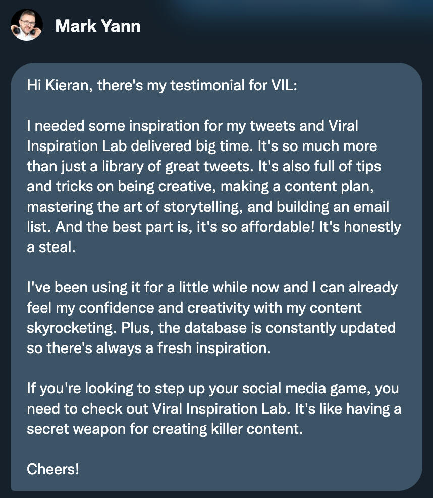 "There comes a time when you don't know what to write. The database in the Viral Inspiration Lab is an ultimate solver. I just open it and start reading through tweets or threads. It takes me a minute or two to get an idea for my next tweet. It just pops up in my head, really. And it's a good one, because it's inspired by good ones. Magic."