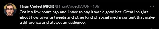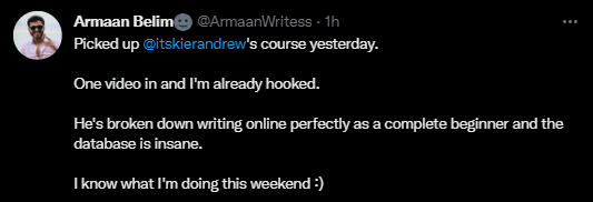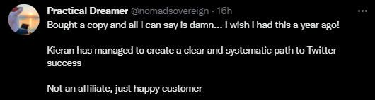 "I went through Kieran's course and he's got a solid understanding of what works on Twitter. I've seen him go from 1000 followers to 16,000. He's definitely figured out what works and has applied it himself. If you want to write on social, this is what you need."