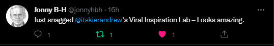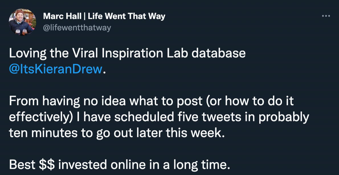 "I had a baby recently and on those days when I can barely scrape my chin off the floor, let alone come up with ideas for Twitter content, the Viral Inspiration Lab has made my life so much easier. And since I bought it, Kieran added more and more resources until it became the place I go whenever I have free time (which admittedly isn't often) to improve my writing, storytelling. Easily worth the investment, if you ask me!"