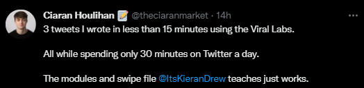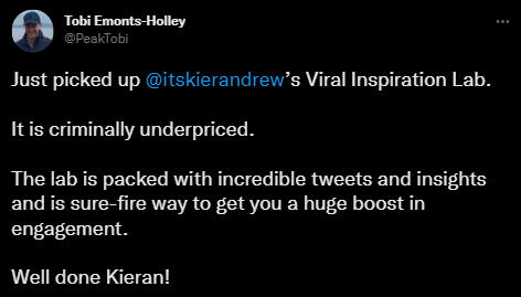 "Kieran has completely changed the game with The Viral Lab. The video tutorials & multiple volumes of tweets & threads break down the core concepts of writing highly engaging content online.Iâve used it for a week and crossed on one of my tweets 1k likes already!If youâre a beginner or expert, this product is a must have!"