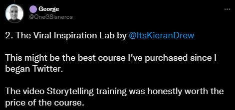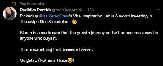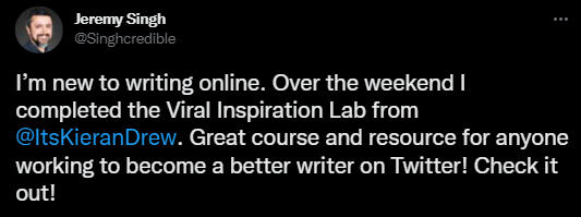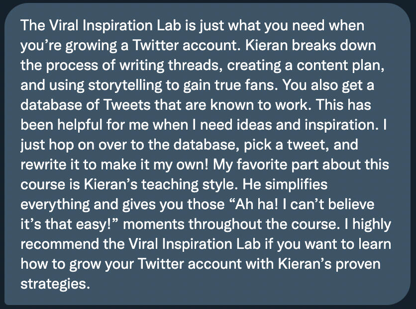 "Kieran's Viral Inspiration Lab is an amazing audience building course! It has incredibly useful content on audience building, Twitter thread writing, content writing, digital storytelling and much more.Moreover, Kieran keeps updating it with new and relevant information, so its value keeps going up.If you are looking to grow on social, this is a must!"