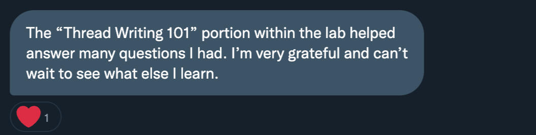 "The Viral Inspiration Lab is super helpful and useful for learning about the process of writing . Before this course I didnât realize how the looking glass technique was so engrained into how people wrote tweets but now I look at the process completely differently."