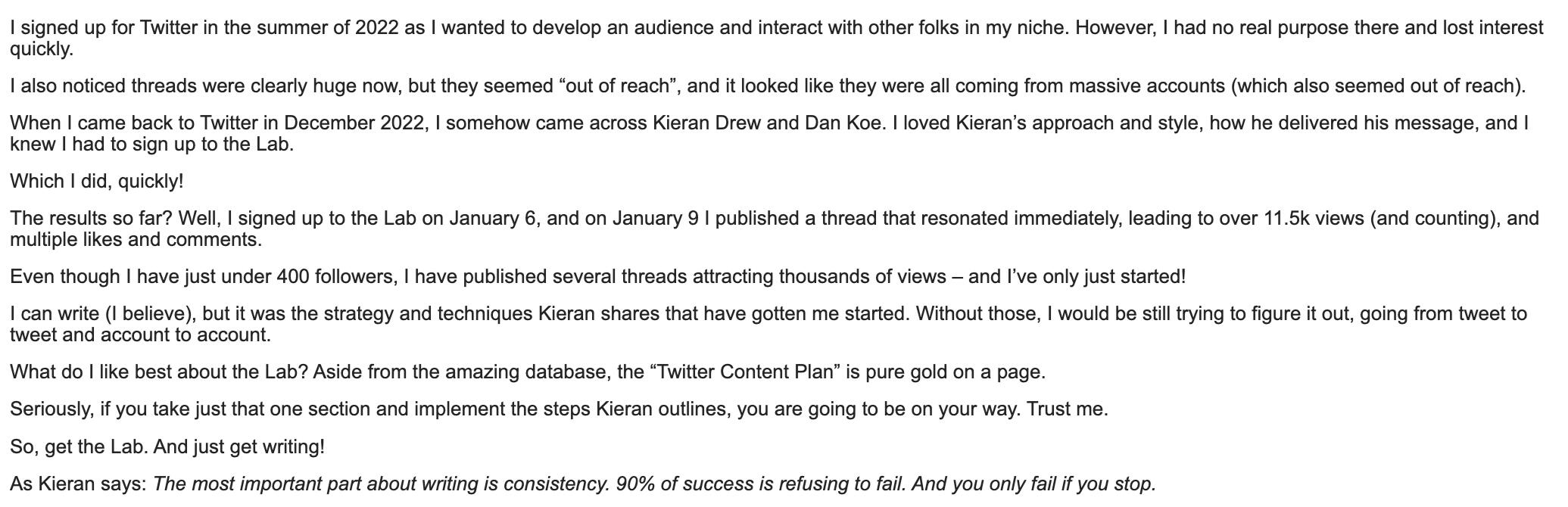 "Kieran's advice on writing is absolutely fantastic and The Lab is a powerful resource for anyone on Twitter. Well worth the investment."